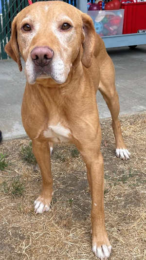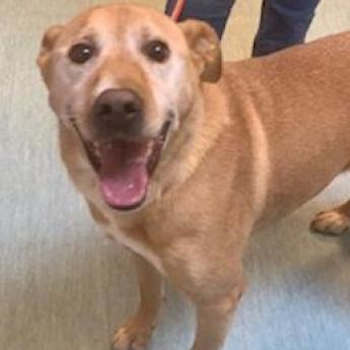 This 7-year-old female Labrador retriever mix has a short gold coat.