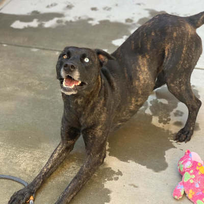 “June” is a 2-year-old female catahoula leopard dog mix has a short brindle coat.