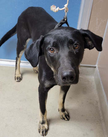 This 2-year-old male Labrador retriever-black and tan coonhound mix has a short black and tan coat.