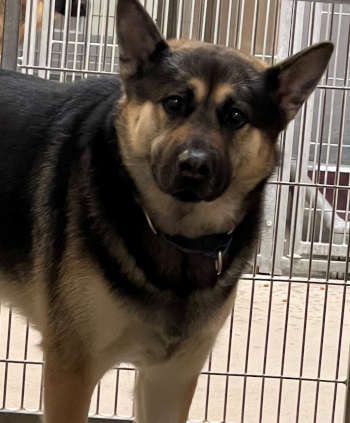 “Maya” is a 2-year-old female German shepherd with a short black and tan coat.