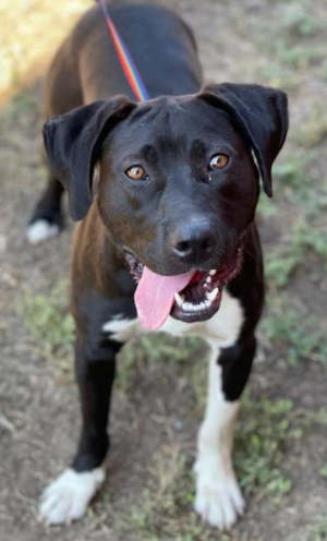 This 1-year-old male hound mix has a short black and white coat.