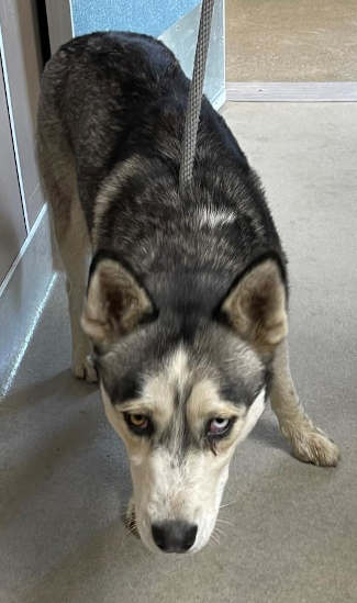 This 2-year-old female husky has a gray and white coat.