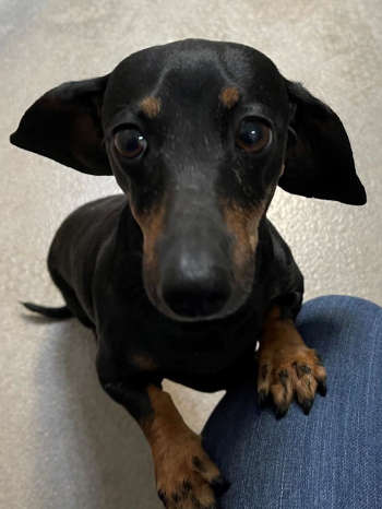 This 3-year-old female dachshund has a short black and tan coat.