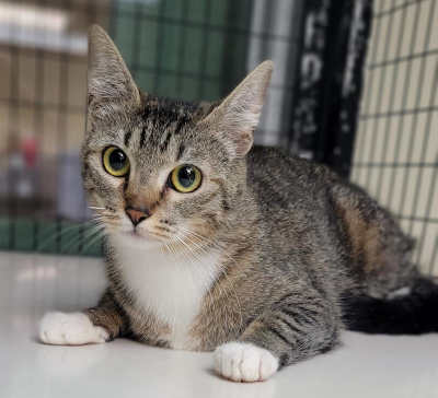 This 2-year-old female gray tabby has a short coat with white markings.