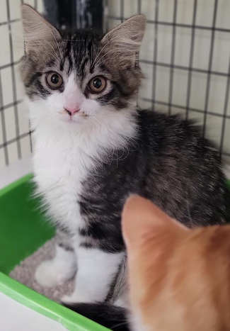 This male domestic shorthair kitten has a gray tabby coat with white markings.