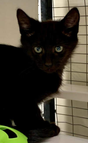 This male domestic shorthair kitten has an all-black coat.