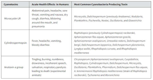 The table below summarizes the health effects caused by the most common toxin-producing cyanobacteria.