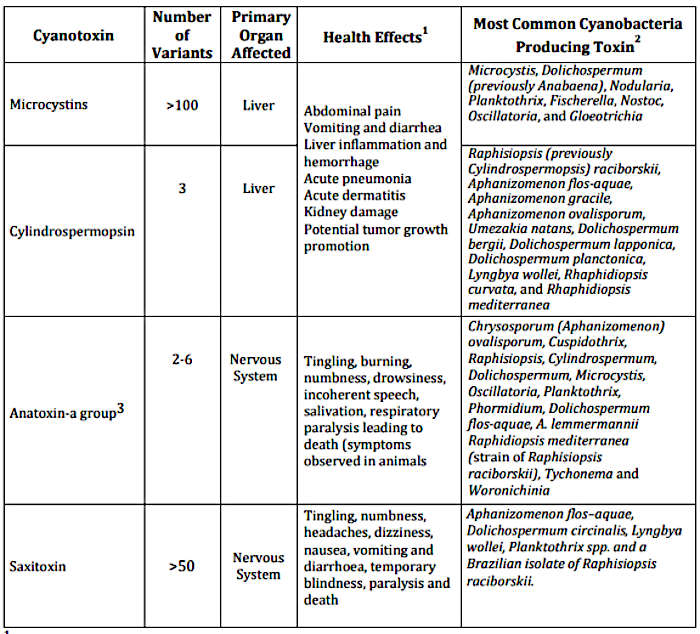 Microscopy conducted on these samples determined the dominant genus of cyanobacteria present was Microcystis sp. The chart below lists cyanotoxins and the cyanobacteria that produce them, along with potential health effects from exposure to the toxins.