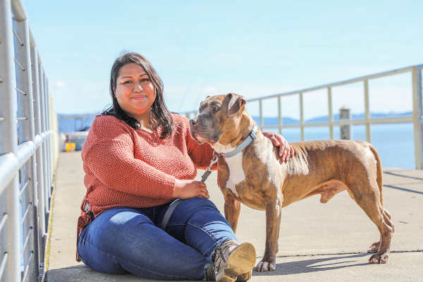 “Cali” is a female pit bull terrier with a short black and white coat.