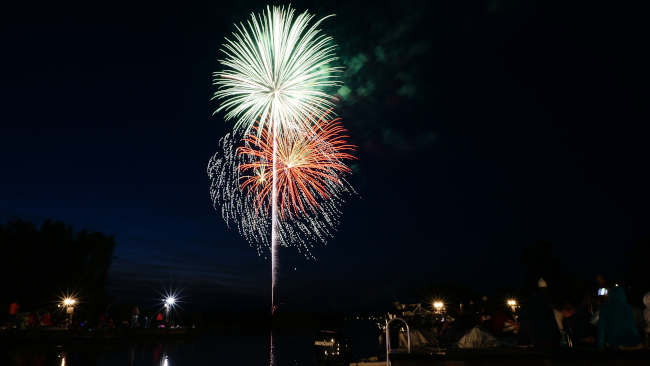 The fireworks display begins at dark offshore of Austin Park and beach.