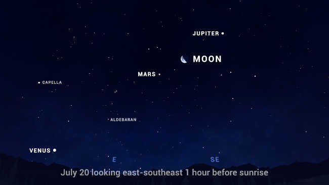 The planets are spread out across the morning sky, accompanied by bright stars, Capella, Aldebaran, and Fomalhaut. On July 20, look for the half-full, last-quarter moon between Mars and Jupiter. And the following morning, you'll find the Moon sitting right next to Mars.