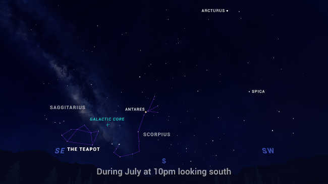 Over the course of the night, it appears to tilt as if its spout is pouring out a cosmic "cuppa." And under dark skies, the Milky Way appears as a plume of steam rising from the spout. So here's hoping you get a chance to enjoy the Milky Way in July, or at least that you find your way to the galaxy's core thanks to the Teapot.