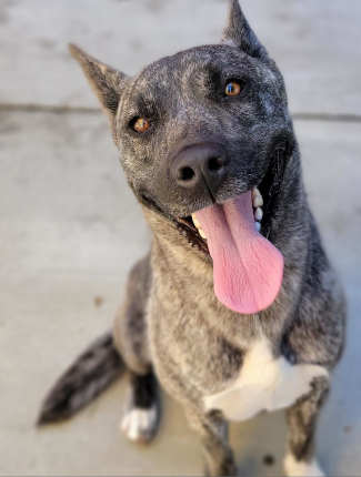 “Pixie” is a 1-year-old female shepherd mix with a gray brindle coat.