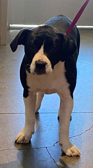 This young female pit bull terrier has a short black and white coat.