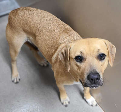 This 2-year-old female German shepherd mix has a short tan coat.