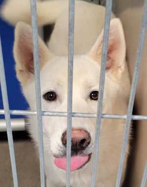 This young female shepherd mix has a white coat.