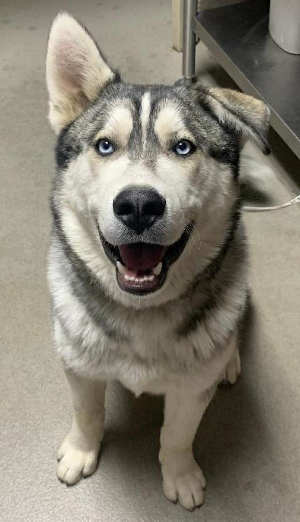 This 2-year-old male husky has a gray and white coat.