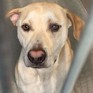 “Lucky” is a 3-year-old male Labrador retriever with a short yellow coat.