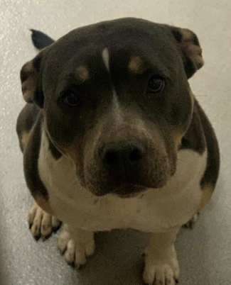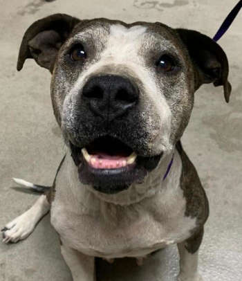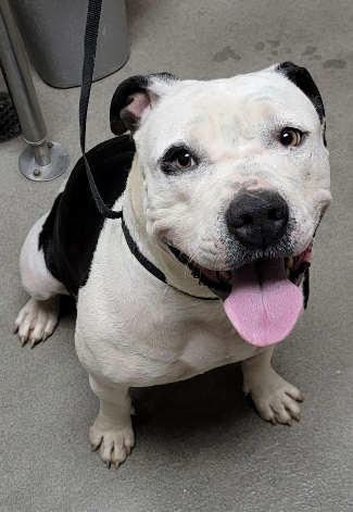 “Missy” is a 3-year-old female pit bull terrier with a black and white coat.