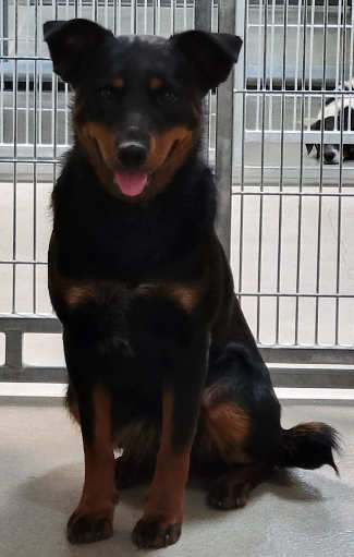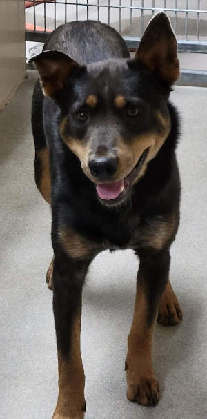 This 2-year-old male American blue heeler-Rottweiler mix has a short black and tan coat.