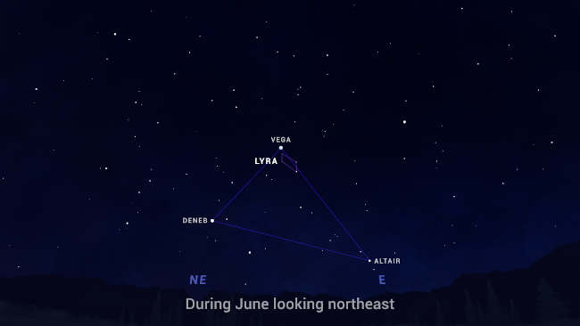 So let the bright star Vega lead you to Lyra, the harp constellation, in the June sky. And if you see it as an eagle, or a diamond ring, or a llama, well that's perfectly OK too ...