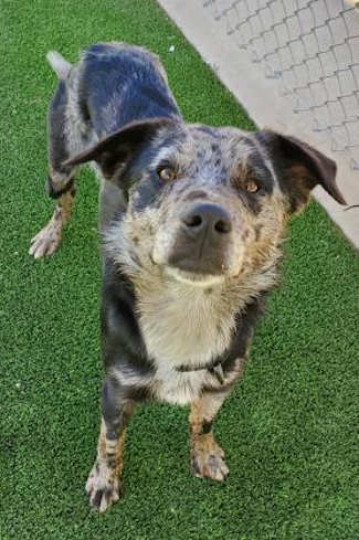 “Captain” is a male border collie mix with a black, white and blue coat.