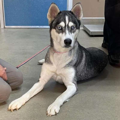 “Blue” is a 4-year-old female husky with a gray and white coat, and blue eyes.