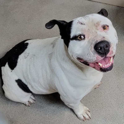 This 3-year-old male pit bull has a short black and white coat.