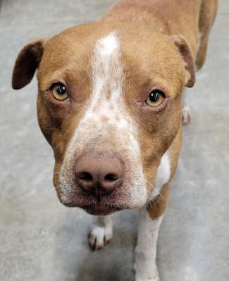 This 1-year-old male pit bull has a short brown coat with white markings.