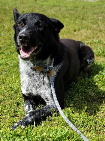 This 3-year-old male cattle dog has a short black and white coat.