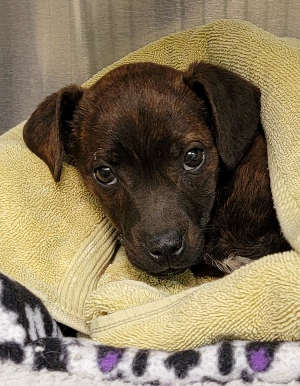 This female Chihuahua mix puppy has a short brown coat.