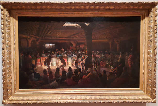 It took the artist a full two years to complete the painting, and he made numerous trips to the Elem Pomo Indian village at Clear Lake during this time for research and inspiration.