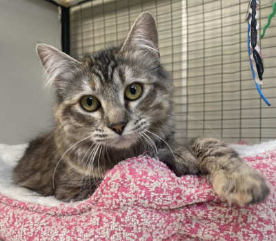This 1-year-old female domestic medium hair cat has a gray tabby coat.