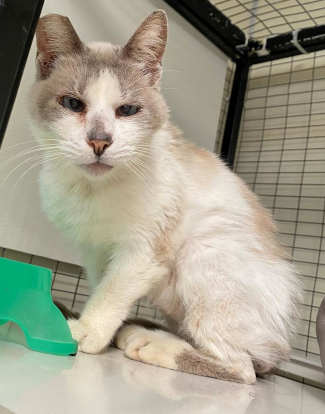 This 5-year-old female Siamese cat has a short white coat with gray markings.