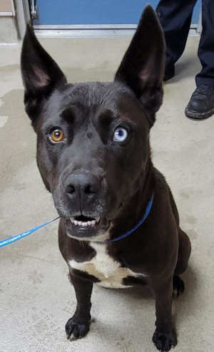 This 1-year-old female husky-pit bull mix has a short black coat.