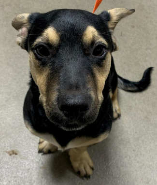 This female German shepherd mix puppy has a short black and tan coat.