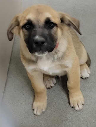 This female German shepherd mix puppy has a short tan and white coat.