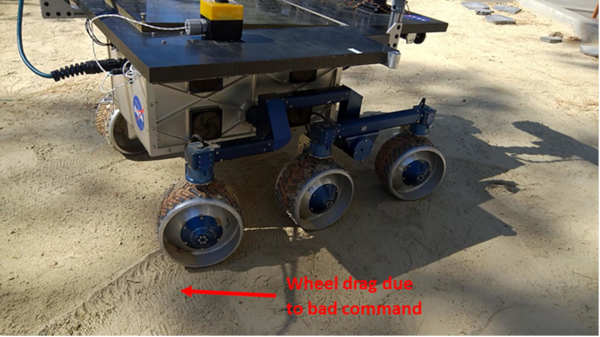 This condition resulted in one wheel turning to the right instead of the left, causing that wheel to drag across the Mars Yard. The rover telemetry data appeared fine despite the faulty command; in fact, the rover still reached its drive goal because the five other wheels compensated for the one that was dragging.