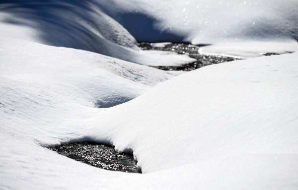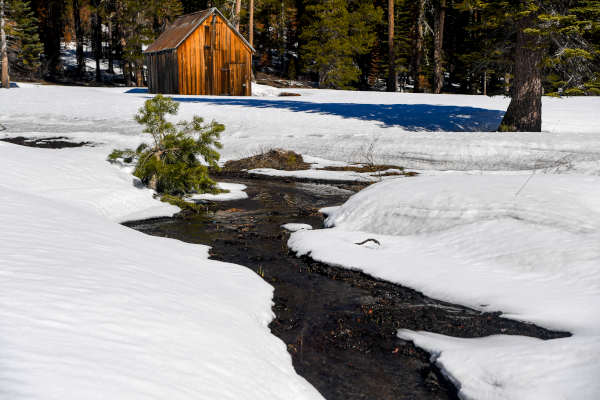 Snow melts into a creek that flows into the South Fork American River, near the site of the California Department of Water Resources third media snow survey of the 2022 season at Phillips Station in the Sierra Nevada Mountains. The survey is held approximately 90 miles east of Sacramento off Highway 50 in El Dorado County. Photo taken Tuesday, March 1, 2022, by Ken James/California Department of Water Resources.