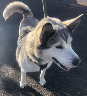 “Chai” is a female Alaskan husky mix with a gray and white coat.