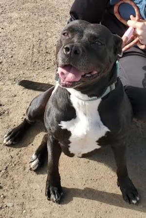 “Andy” is a male American pit bull mix with a short gray and white coat.