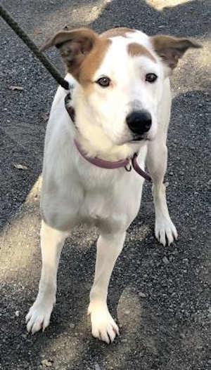 “Priscilla” is a female Brittany spaniel mix with a white and copper coat.