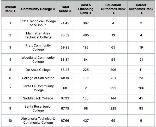 The national top community college in the ranking, State Technical College of Missouri, delivers one of the best education and career outcomes. However, it ranks 367 in cost and financing.