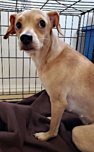 “Isabella” is a female Chihuahua mix with a short tan coat.