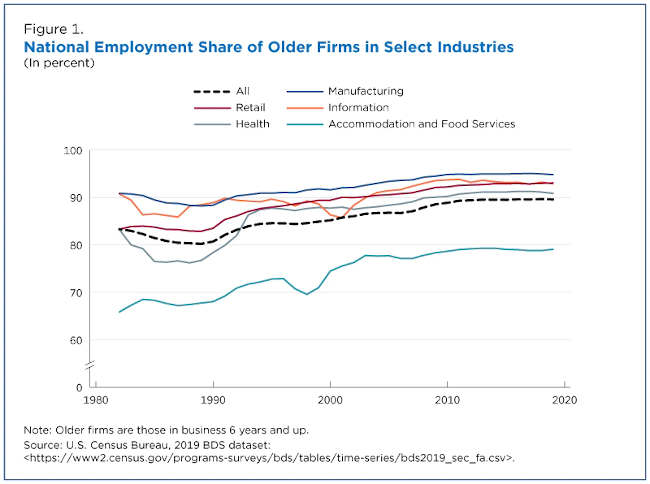After falling in the 1980s, the share of employment at more mature firms rose steadily, representing approximately 90% of all employees by 2019 (Figure 1).