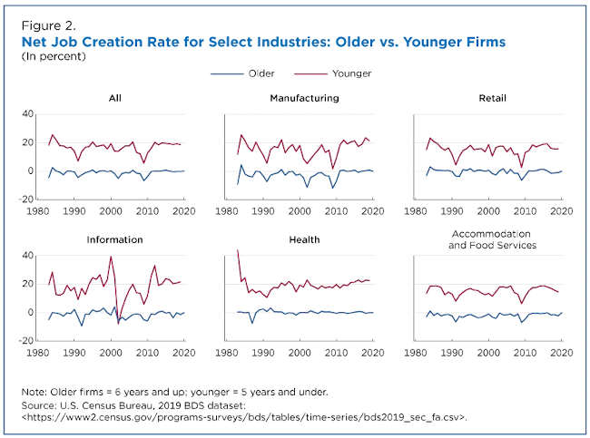 The job creation rate is notably higher for young firms than for old ones — the NJCR has hovered around 15% to 20% for younger firms throughout the time series but was roughly 0% and often negative for more established firms.