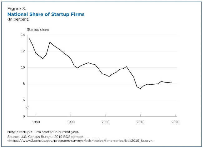 Reconciling these facts requires noting that there are fewer startups over time and in turn fewer young firms over time (Figure 3). That is, the net growth rate differential between young and old has not changed much but there are fewer and fewer young firms over time.