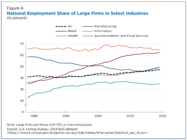 The national share of employment at these large firms has grown from 41% at the beginning of the time series in 1978 to 48% at the end of the series in 2019.