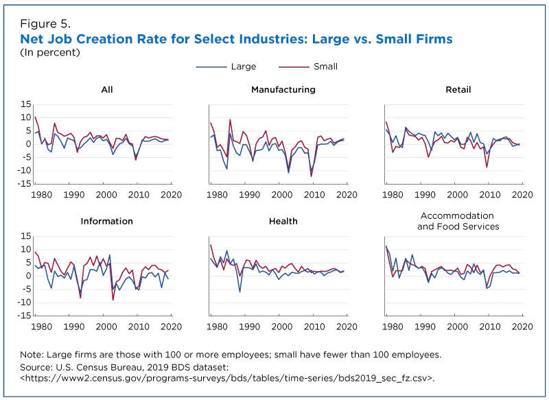 In this story, we summarize recent findings using the publicly available statistics to describe the dynamics of the U.S. economy over the past 40 years. We specifically focus on the role firms of different ages and sizes played in the creation of jobs across various industries.