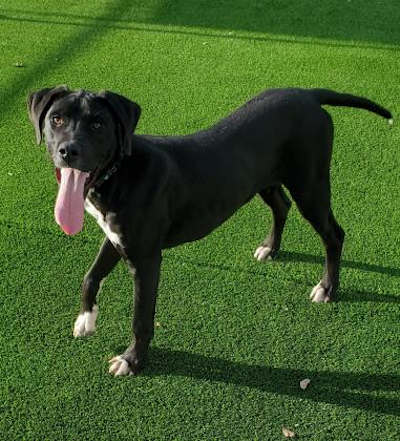 “Maui” is a male Labrador retriever mix with a short black coat and white markings.